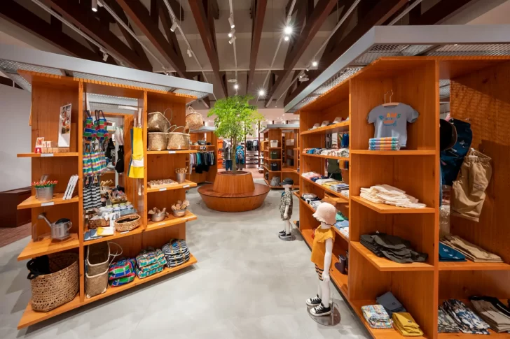 店内は、ファミリーでショッピングを楽しむ市場をイメージ。店舗中央には、シンボルツリーを囲む円形のベンチを配し、さらにその周囲には屋台に見立てた什器を設置したほか、入り口付近にはイベントスペースも設けた。