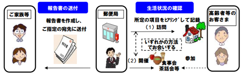 郵便局社員がお客を訪問、生活状況を確認し、その結果をあらかじめお客が指定した報告先に知らせるもの。