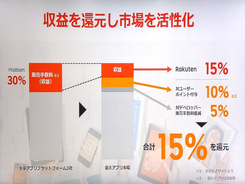 スマホアプリの販売では、通常は30%の販売手数料をアプリの販売プラットフォームの提供事業者が得ている。楽天では、販売手数料を半額の15%に抑えることで、アプリ開発者への利益還元を進め、新たなアプリの開発資金の支援などを目指す。