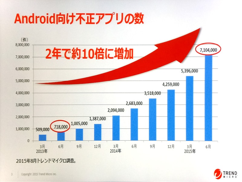 全世界では、1秒間に約2000件、毎日2億件を超える問い合わせがある。アンドロイド向け不正アプリの数は、2013年6月に約71万8000件だったが、2015年6月には710万4000件となった。2年で約10倍に増加して、セキュリティの重要性は高まっている。
