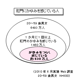 同社が20~59歳の男女800人を調査したところ、20~59歳の人口数にすると、約1947万人が「1カ月に1回以上肛門のかゆみを感じている」ことがわかり、そのうちの630万人が「かゆみをつらく感じている」ことがわかった。