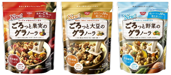ごろっと果実のグラノーラ、ごろっと大豆のグラノーラ、ごろっと野菜のグラノーラ「冷製コーンスープ風味」