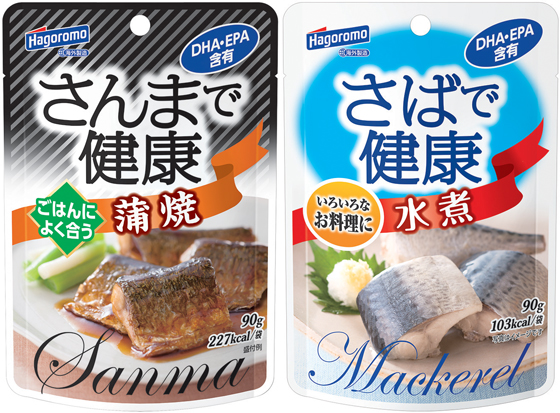 さんまで健康 蒲焼、さばで健康 水煮は、栄養豊富な青魚を手軽にとれるレトルトパウチタイプの惣菜。