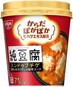 純豆腐 スンドゥブチゲスープは、冬季限定で販売している「ヒハツ エキス」を配合した、寒い季節にぴったりのからだがぽかぽかと温まるカップスープ。ヒハツとは、コショウ科の植物で別名をナガコショウ、またはロングペッパーという。