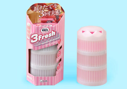 同商品は、消臭ゼリーを円柱形の上下3つの容器に小分けした車用消臭芳香剤。
