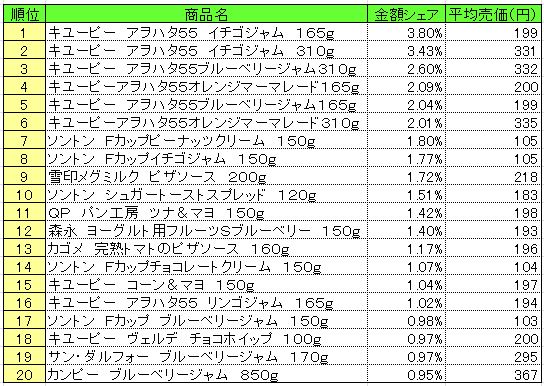 「キユーピー アヲハタ55 イチゴジャム 165g」が1位。引き続き、キユーピーが1~6位を占めた。