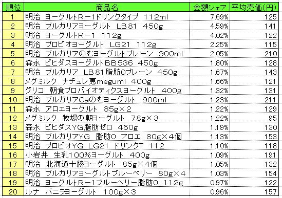 「明治 ヨーグルトRー1ドリンクタイプ 112ml」の1位が続いた。
