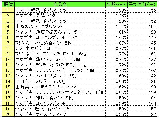 流通経済研究所が提供するPOSデータ分析サービス「NPI CLOUD」によると、4月7~13日の「パン・シリアル類」のPOSデータによる売上ランキング(売上高上位20)は、以下の通りとなった。