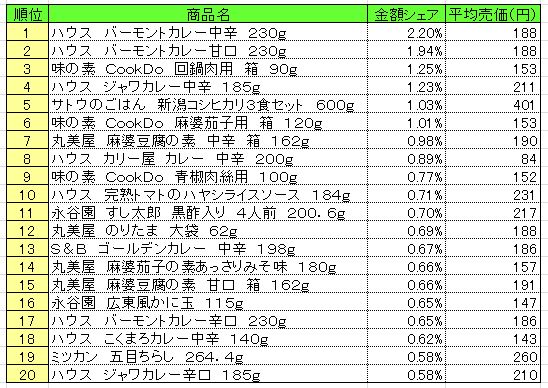 調理品 売上ランキング/7月7日~13日、「ハウス バーモントカレー」の1位続く