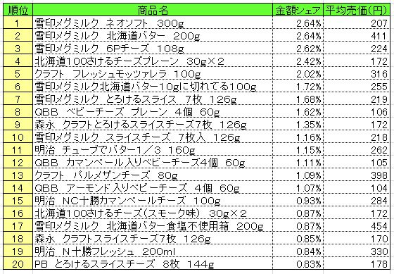 流通経済研究所が提供するPOSデータ分析サービス「NPI CLOUD」によると、8月4日~10日の「乳製品」のPOSデータによる売上ランキング(売上高上位20)は、以下の通りとなった。