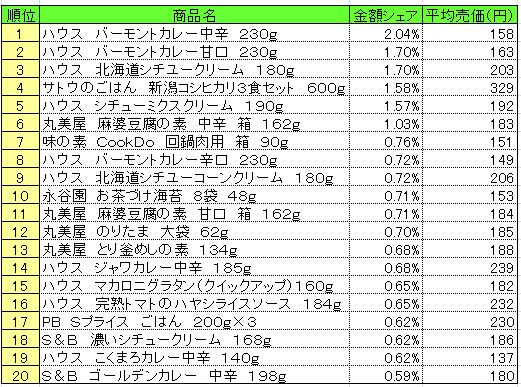 調理品 売上ランキング/9月29日~10月5日、「ハウス バーモントカレー中辛」が1位