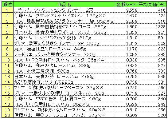 流通経済研究所が提供するPOSデータ分析サービス「NPI CLOUD」によると、14年12月29~15年1月4日の「加工肉類」のPOSデータによる売上ランキング(売上高上位20)は、以下の通りとなった。