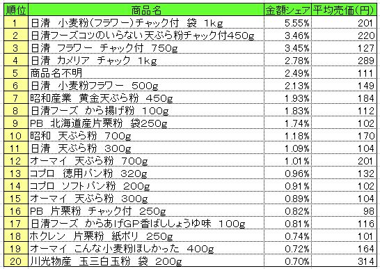 流通経済研究所が提供するPOSデータ分析サービス「NPI CLOUD」によると、3月16~22日の「粉類」のPOSデータによる売上ランキング(売上高上位20)は、以下の通りとなった。