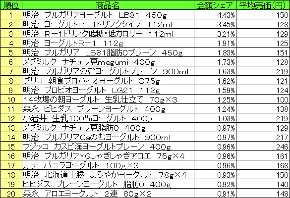 流通経済研究所が提供するPOSデータ分析サービス「NPI CLOUD」によると、4月6日~12日の「デザート・ヨーグルト」のPOSデータによる売上ランキング(売上高上位20)は、以下の通りとなった。