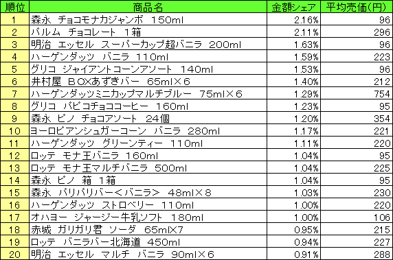 流通経済研究所が提供するPOSデータ分析サービス「NPI CLOUD」によると、5月4日~10日の「アイスクリーム類」のPOSデータによる売上ランキング(売上高上位20)は、以下の通りとなった。