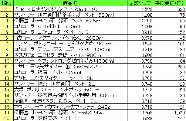 流通経済研究所が提供するPOSデータ分析サービス「NPI CLOUD」によると、6月15日〜21日の「清涼飲料」のPOSデータによる売上ランキング(売上高上位20)は、以下の通りとなった。