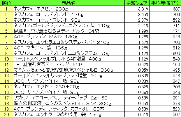 嗜好飲料 売上ランキング/6月22日〜28日、「ネスカフェ エクセラ」が1位