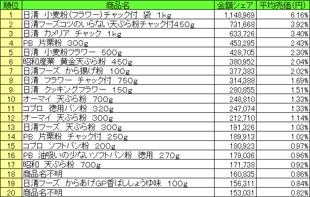 流通経済研究所が提供するPOSデータ分析サービス「NPI CLOUD」によると、7月6日〜7月12日の「粉類」のPOSデータによる売上ランキング(売上高上位20)は、以下の通りとなった。