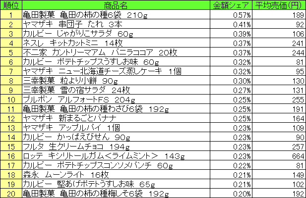 流通経済研究所が提供するPOSデータ分析サービス「NPI CLOUD」によると、7月6日~7月12日の「菓子」のPOSデータによる売上ランキング(売上高上位20)は、以下の通りとなった。