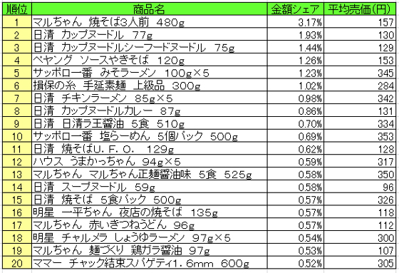 流通経済研究所が提供するPOSデータ分析サービス「NPI CLOUD」によると、8月31日~9月6日の「麺類」のPOSデータによる売上ランキング(売上高上位20)は、以下の通りとなった。