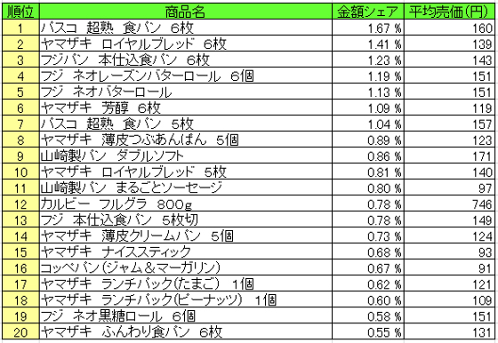 流通経済研究所が提供するPOSデータ分析サービス「NPI Report」によると、11月9日~11月15日の「パン・シリアル類」のPOSデータによる売上ランキング(売上高上位20)は、以下の通りとなった。