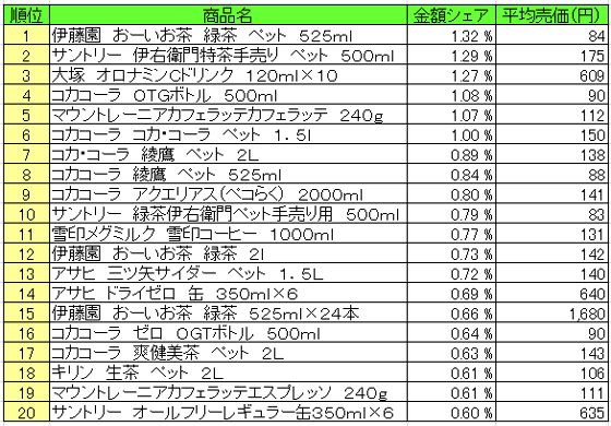 流通経済研究所が提供するPOSデータ分析サービス「NPI Report」によると、11月9日~11月15日の「清涼飲料」のPOSデータによる売上ランキング(売上高上位20)は、以下の通りとなった。