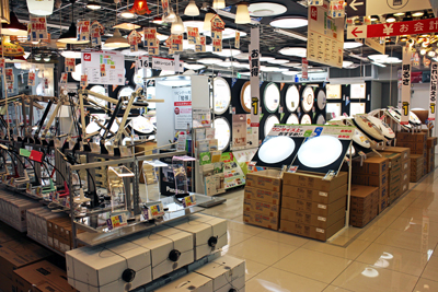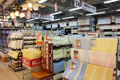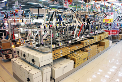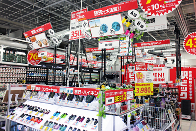 6000㎡という店舗面積でフルラインの品ぞろえをするために、2mの什器を使用するが、店舗の見晴が悪くなるのを避けるため、150cm~170cmの棚板を省き、店舗の奥まで商品を見える工夫をした。見晴を改善することで、商品が探しやすくなるほか、万引き防止の効果も期待できるという。