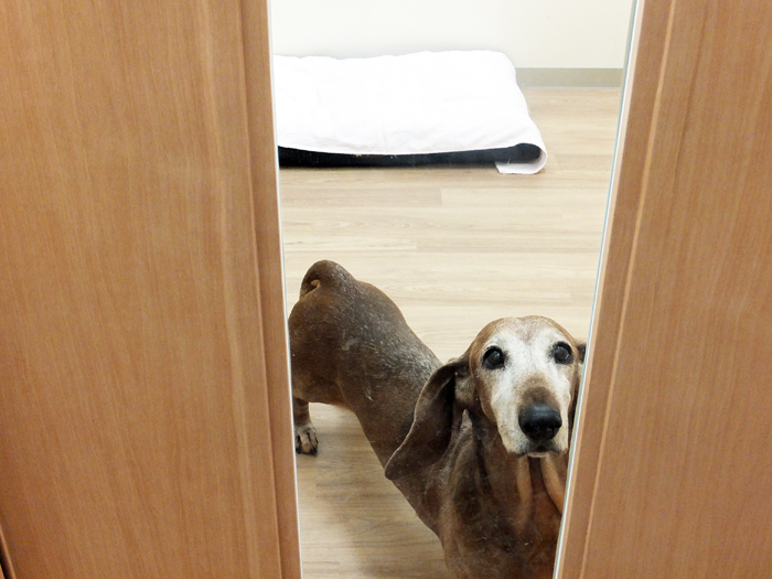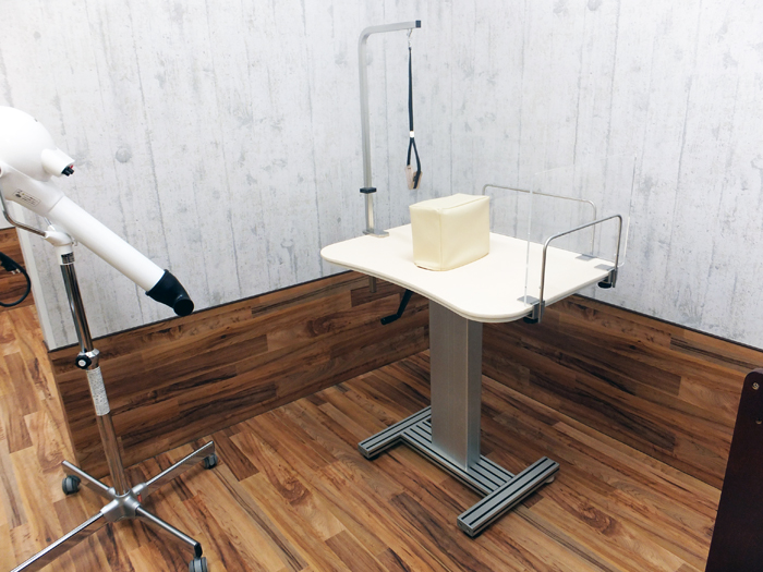 長時間立ったままのトリミングは、シニアの犬には負担がかかるため、シニア犬対応として、足腰に負担の少ないグルーミングテーブルを用意した。