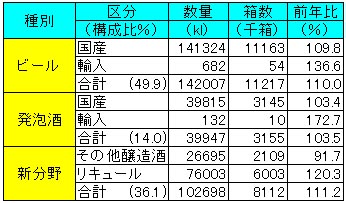 1月のビール類の課税移出数量は、ビールが14万2007kl(前年同期比10.0%増)、発泡酒が3万9947kl(3.5%増)、新分野が10万2698kl(11.2%増)となった。