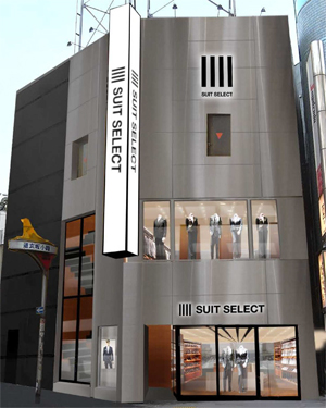 文化村通りに面し、H&M渋谷店の斜め向かいに3フロアの店舗を開店するもの。SUIT SELECTは、リアルスーツをコンセプトにアートディレクターの佐藤可士和氏監修のもと、ツープライス業態を展開。