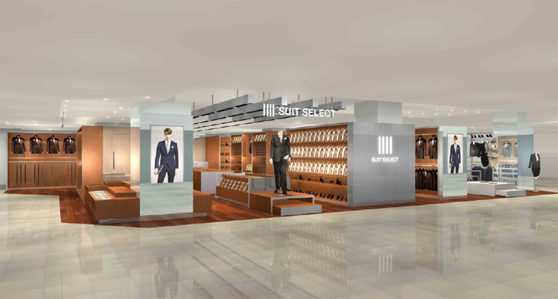 富山県の第2号店となるSUIT SELECT店舗。SUIT SELECTは、リアルスーツをコンセプトにアートディレクターの佐藤可士和氏監修のもと、ツープライス業態を展開。