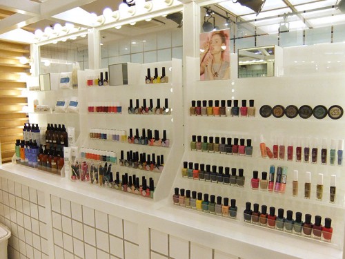 化粧品は仕入商品で対応しているが、店内にパウダールームを設置。販売する全商品を集め、ドライヤーも設置、単なる試供だけでなく、きちんとメイクもできる環境を整えた。