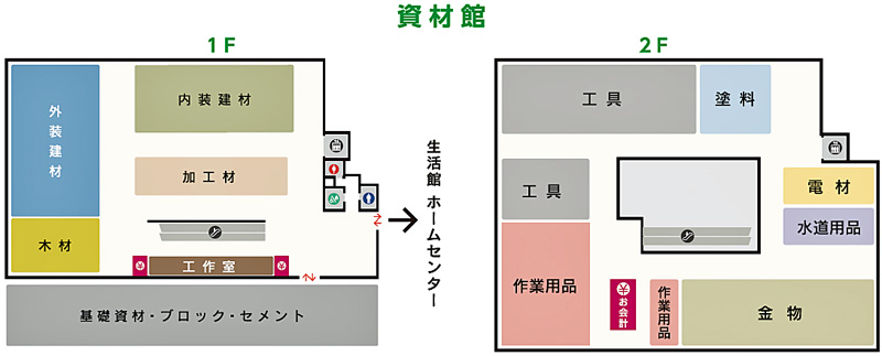 1階にホームセンターフロア、2階に家具・インテリアフロアを配置した複合店舗。