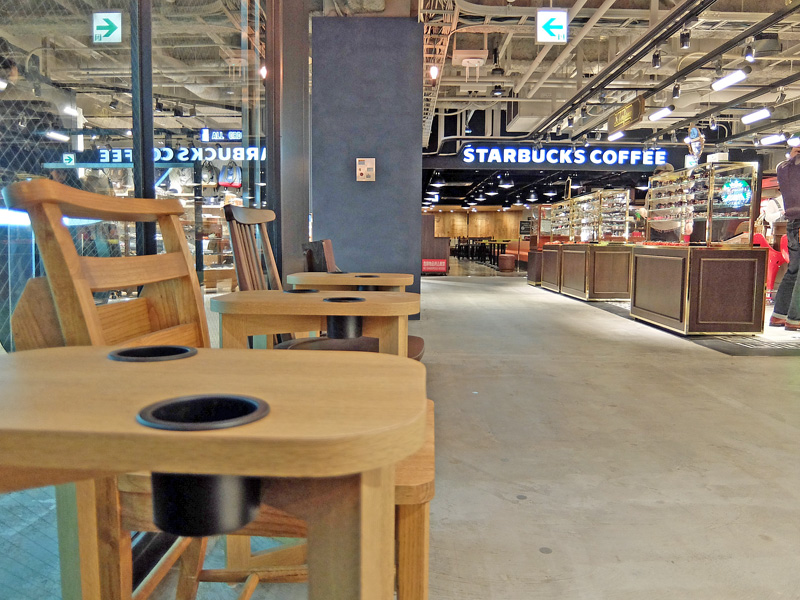カフェを導入している休憩スペースでは、カップホルダーを椅子に設置。自然に施設内で時間を消費できる環境を目指した。