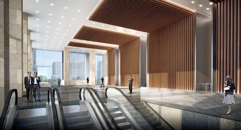 共用部は、天井高7.5m、KPFがデザインした木調ルーバーを基調とした都会的デザインのオフィスエントランスを整備し、テナント企業役員向けのVIP専用エレベーターを設けるなど、洗練されたデザインと、オフィスとしての利便性向上に配慮した計画とする。