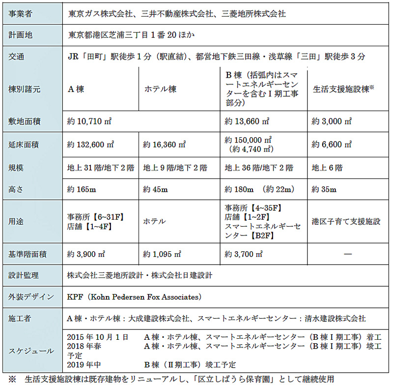 JR田町駅東口隣接の東京ガス所有地(約2万8000m2)において、オフィス、商業施設、ホテルなどからなる全体延床面積約30万m2の複合ビジネス拠点を創出する。
