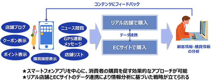 イーボスオムニパックは、小売店のリアル店舗とECサイト間でデータを連携させるスマホアプリを構築することにより、顧客の属性情報や購買履歴情報の一元管理を可能にする。
