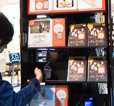 SHIBUYA TSUTAYA5階の映像レンタルフロアに設置したNFC対応スマートフォンを店頭POPや商品パッケージにかざすだけで、DVDレンタルしている映画・ドラマなどの予告映像を視聴することができる。