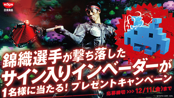 日清食品は、「錦織選手が撃ち落したサイン入りインベーダーが1名様に当たる!プレゼントキャンペーン」を実施している。