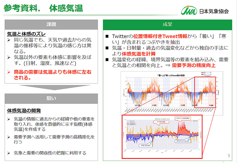 商品需要予測をするにあたり、日本気象協会では体感気温を重視している。商品の需要は気温よりも体感に左右されることに着目し、独自に体感気温を計算することで、需要予測の精度を向上させている。