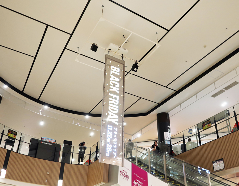 情報発信力について、両面シースルー天吊りバナーを取り入れた。全館プロモーション、季節装飾用の天吊り装飾バナーを実施できる透明LED付きフィルムを利用したサイネージに置き換えた。