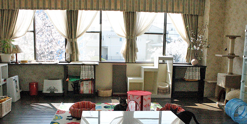生体販売をしないため、ガラスのペットケースはないが、保護猫たちが生き生きと暮らす部屋があり、猫と触れ合うことができる。