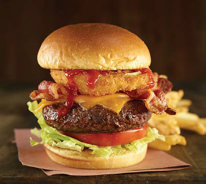 「レジェンダリーバーガー」は、8ozのビーフパテが大迫力のプレミアムバーガー。パテからあふれ出す肉汁に、チェダチーズ、ベーコン、フライドオニオンリングの食感と甘みが絡み合う、ぜいたくなテイストを楽しめる。