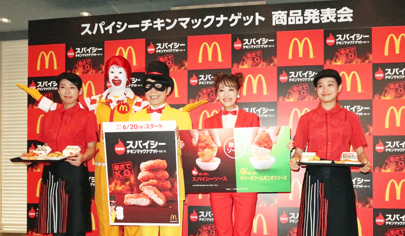マーケティング本部河野辺孝則上席部長は、「チキンマックナゲットは、1983年にてんぷらをモデルにアメリカで誕生、1984年には日本で発売したちまち人気商品となった。2016年からはナゲットをお得な価格や限定ソースで楽しむ怪盗ナゲッツキャンペーンを継続してきた。今回はぜひ通常のナゲットとスパイシーな新味を食べ比べてほしい」と説明。