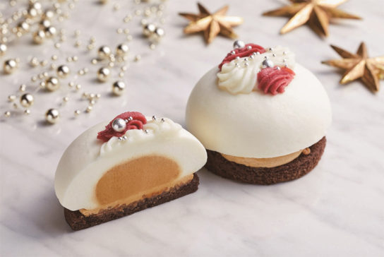 「X’masブラン」は、ホワイトチョコレートムースの中に、2種類のほろ苦いキャラメルムースを閉じ込めた。クランチのサクサク感がアクセントになっている。