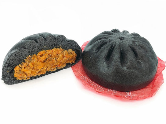 豚ひき肉、にんにくと練りごまなど、旨味がある具材を使用。もっちりとしたくちどけの良い生地に竹炭を練り込むことにより、インパクトのある真っ黒な見た目に仕上げた。