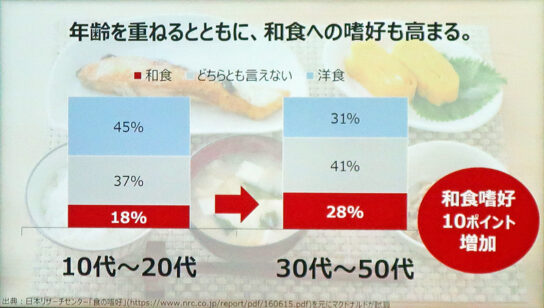 日本リサーチセンターが発表した「食の嗜好」を元に、マクドナルドが独自にした試算によると、10代~20代に比べて、30代~50代は和食の嗜好が10ポイントほど増加する。年齢を重ねるとともに、和食への嗜好も高まる傾向がある。