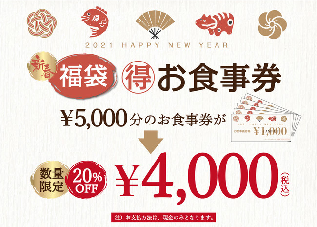 4000円で5000円分の食事券が入ったお得な福袋となっている。