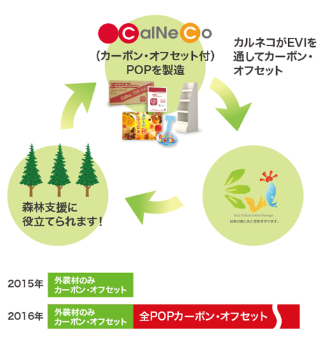 カルビーのカルネコ(CalNeCo)事業部は4月1日、カーボン・オフセット制度を取り入れた店頭販促(POP)用の陳列用立体什器やポスターの受注・生産を開始する。