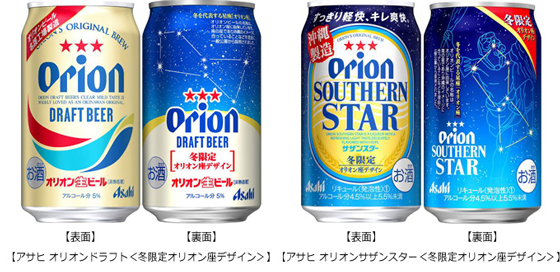 アサヒビールは12月13日、オリオンビールが製造した「オリオンドラフト 冬限定オリオン座デザイン」と「オリオンサザンスター 冬限定オリオン座デザイン」を数量限定で発売する。